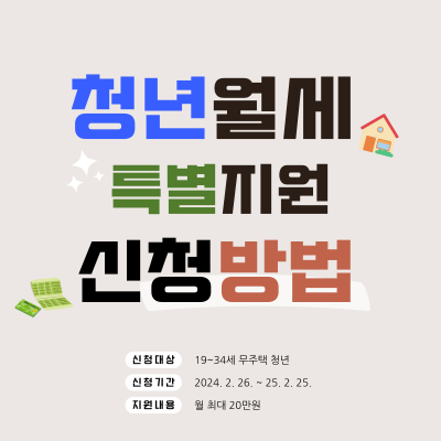 2024년 2월 26일부터 2025년 2월 25일까지 신청 가능한 청년월세 특별지원은, 만 19세에서 34세 사이의 무주택 청년을 대상으로 매월 최대 20만 원의 월세를 12개월 동안 지원하는 프로그램입니다.