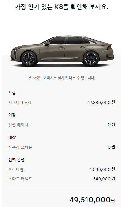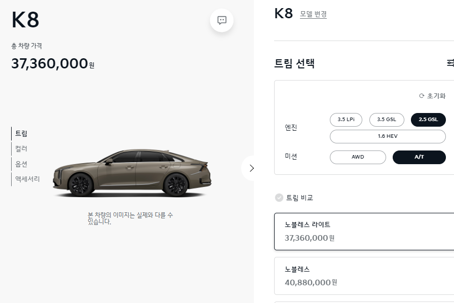 K8의 가격은 2.5 가솔린 3736만~4550만 원, 3.5 가솔린 4048만~4837만 원, 1.6 터보하이브리드 4372만~5167만 원입니다. 아래의 표를 통해 각 트림별로 한번더 정리했습니다.